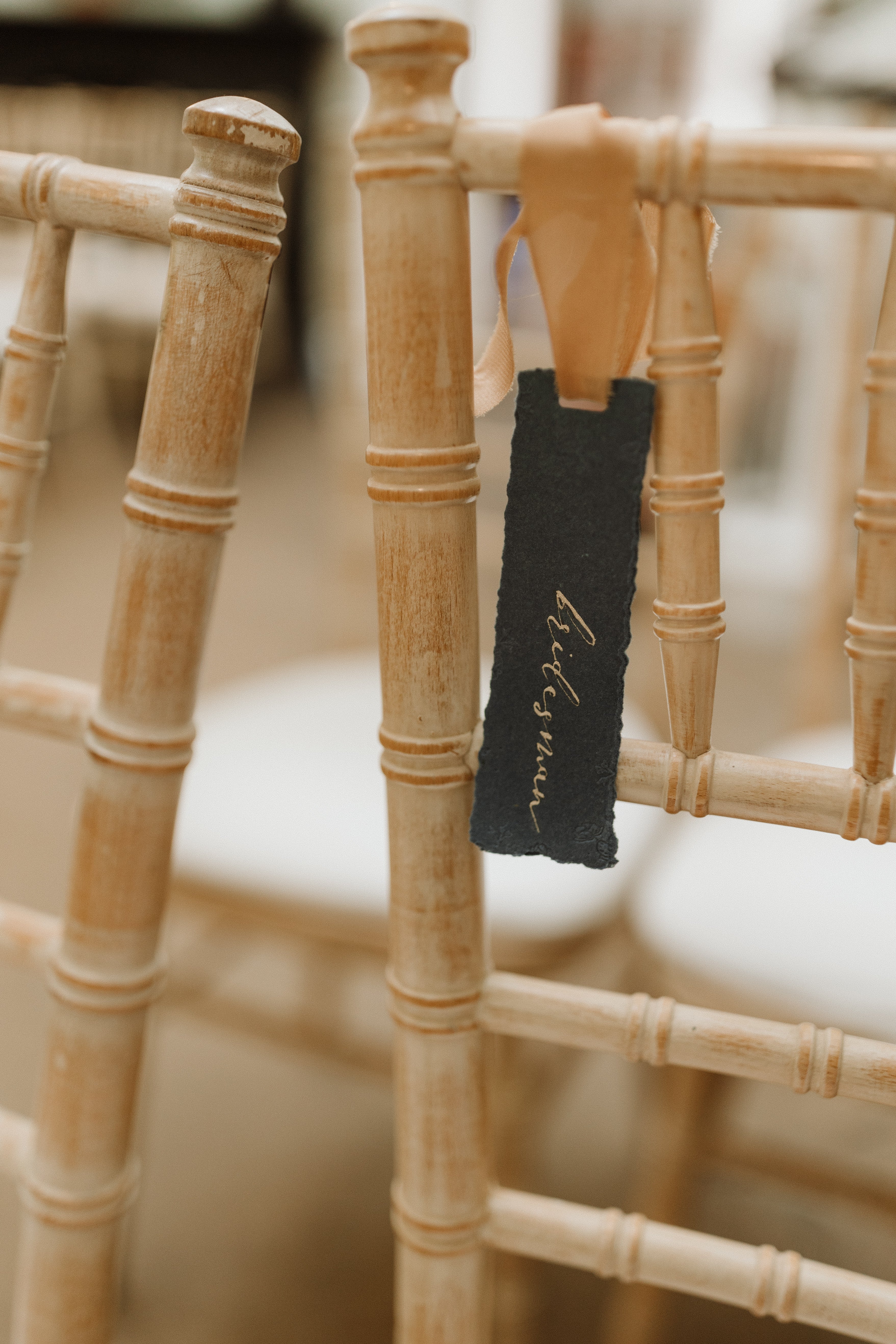 hand torn deckle edged handmade paper, hand written with gold calligraphy and finished with a hand dyed silk ribbon and delicate floral embossed details.