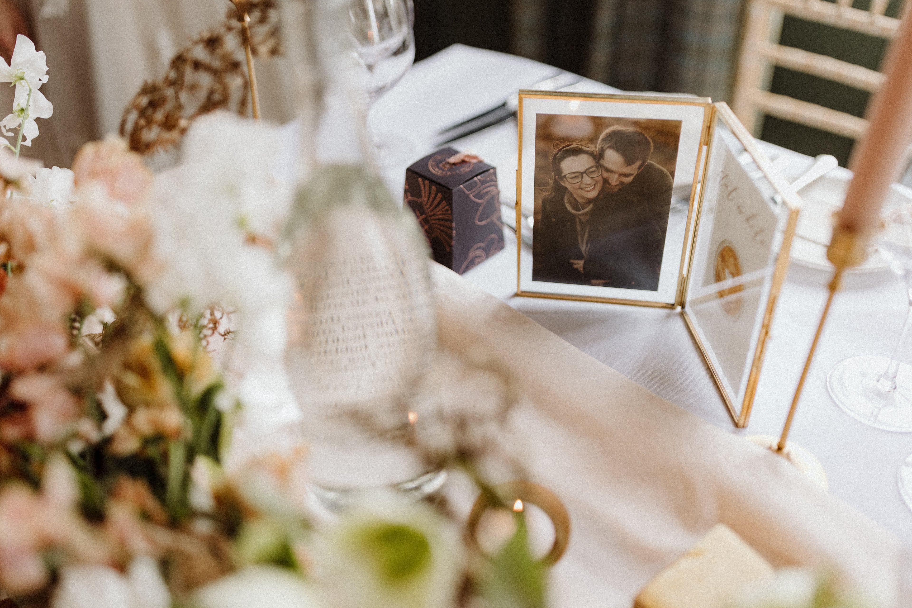 Autumn is by far my husband's and my favourite time of the year, we love going for dog walks with our beagle on the moor in the crisp air, taking in the sights of burnt oranges and earthy tones of the landscape. But most of all we love to cuddle up after a long walk in nature with a handmade mug full of coffee as we are kind of coffee addicts. Naturally when coming up with inspiration and a colour scheme for our wedding day it all just clicked into place. From the hand dyed ribbons in our favourite autumn colours that adorned place-name cards to the table names which were coffee types obviously, the frames displaying our table names also included photographs of us on the moor, and the confetti station had takeaway coffee cups filled with confetti. It was all inspired by coffee and autumn!