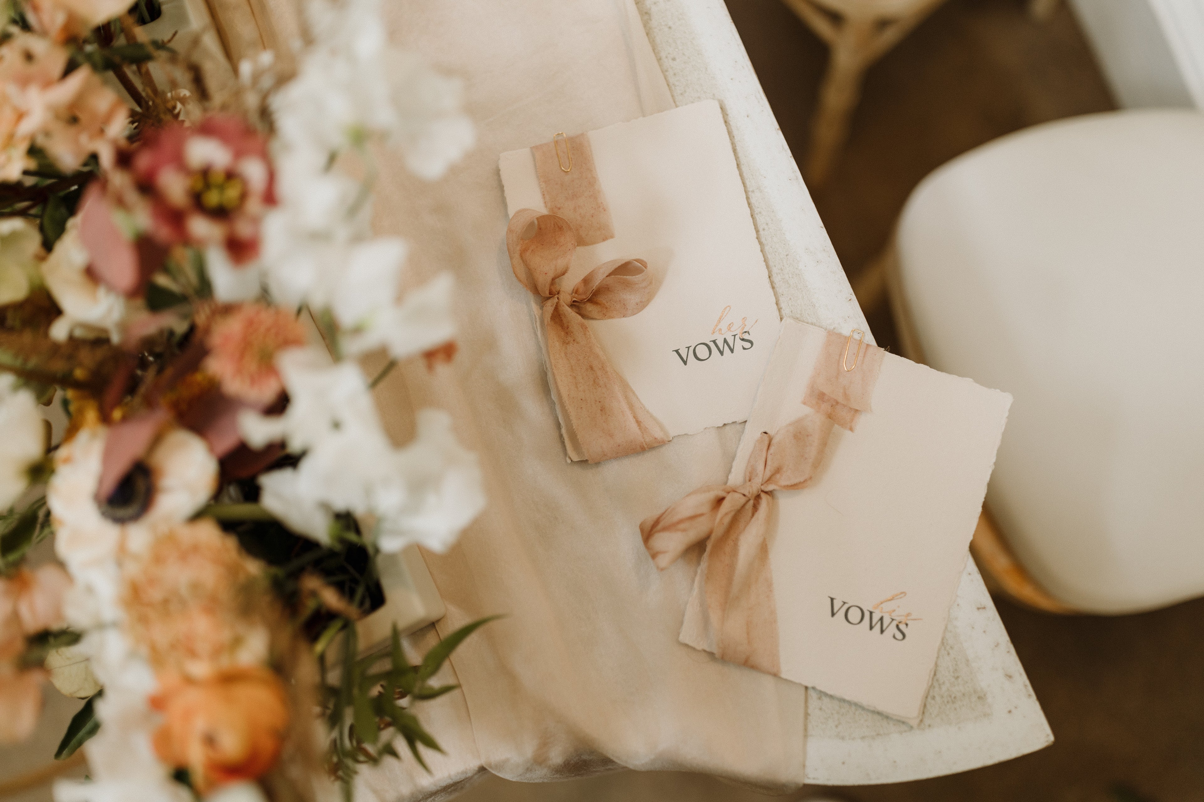 Personalised vow books on handmade paper, finished with hand dyed silk ribbon and metallic peach calligraphy