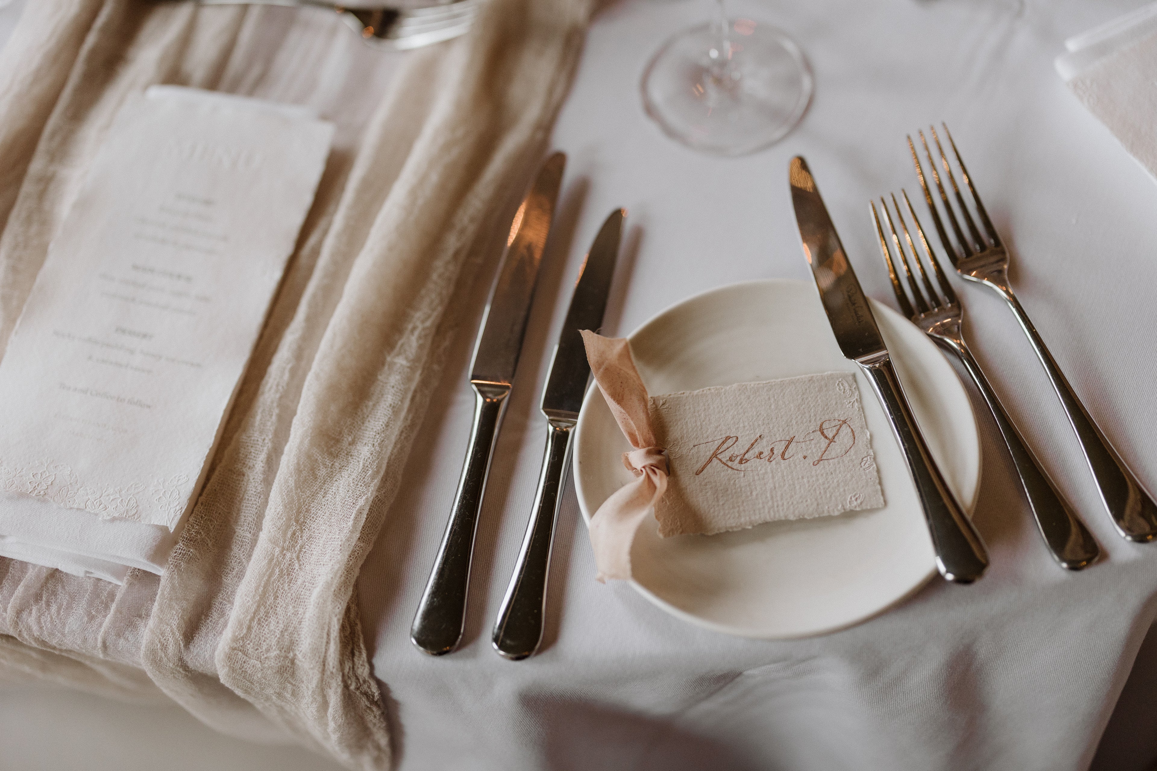 hand torn deckle edged handmade paper, hand written with gold calligraphy and finished with a hand dyed silk ribbon and delicate floral embossed details.