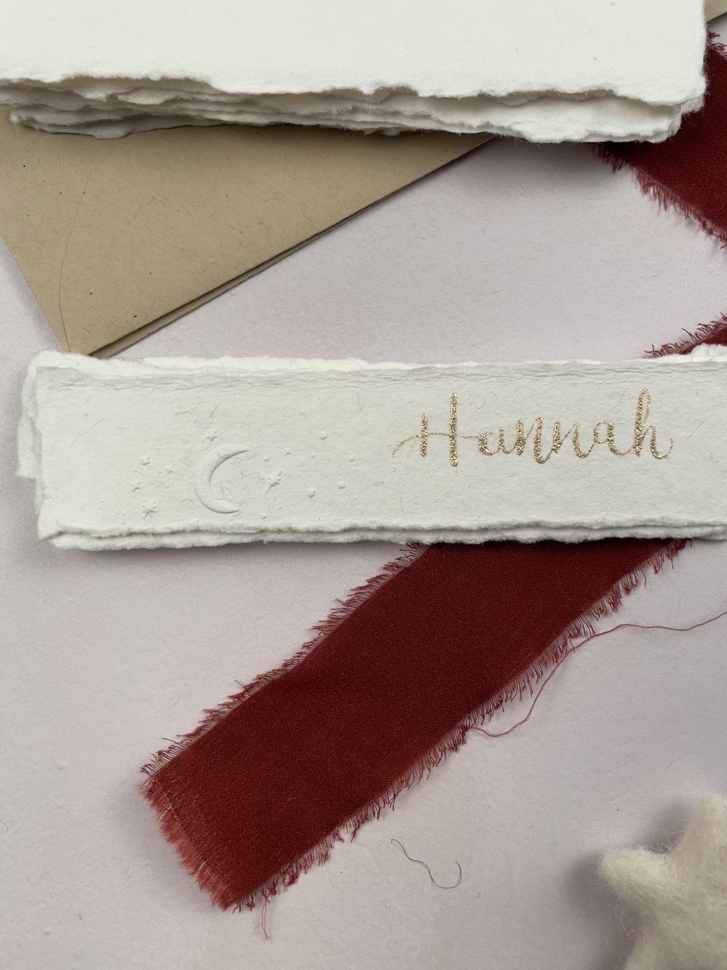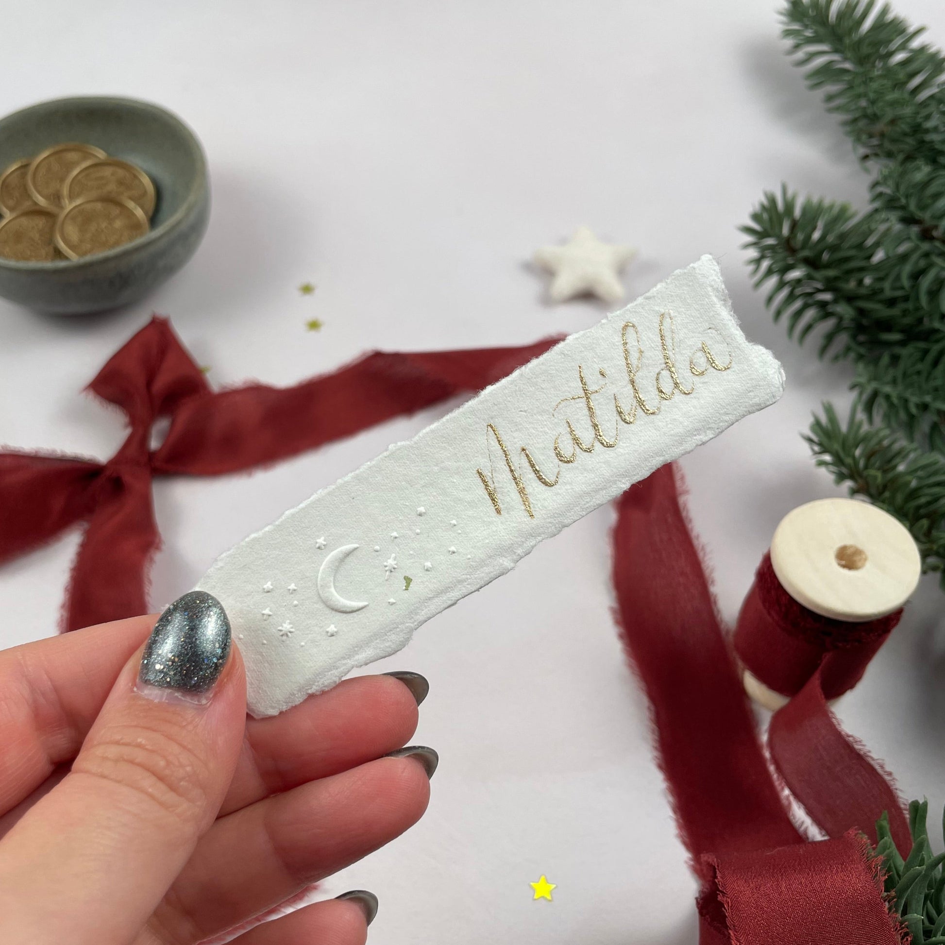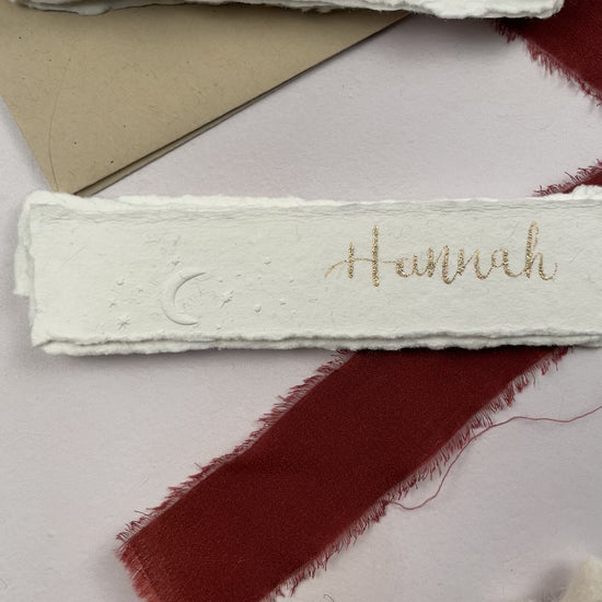 Stunning white handmade paper placename cards finished with hand lettered calligraphy in gold metallic ink, complemented by a delicate embossed celestial design. Choose from four sizes.