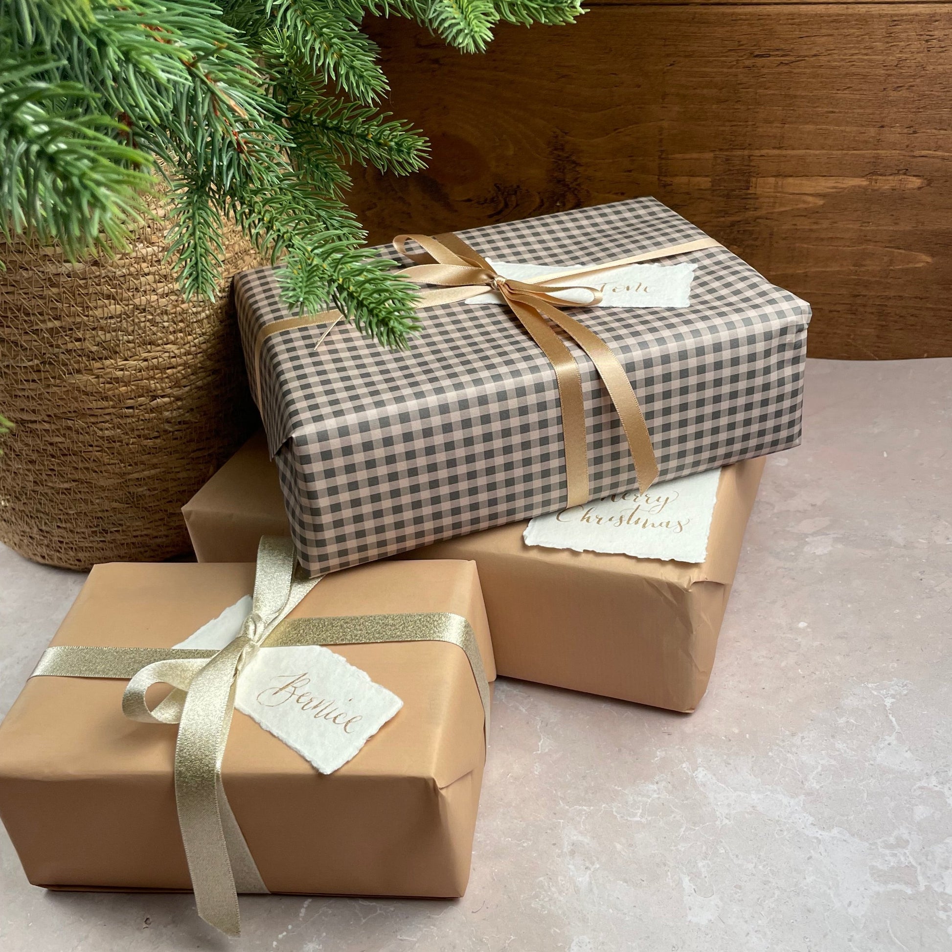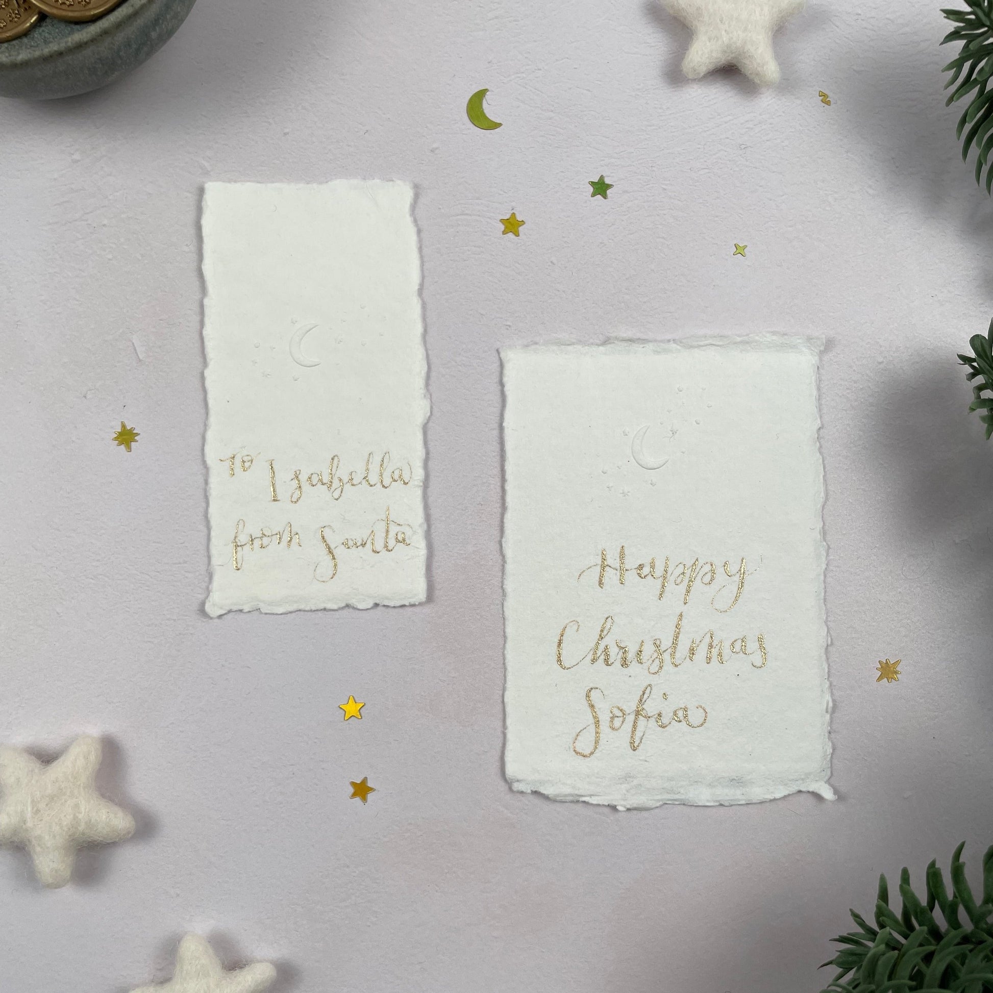Add a personalised message which will be hand lettered in gold calligraphy. For Slim and Small tags first name only included. For a Large or Medium tags your message could be ‘Merry Christmas Josh’ or ‘To Liz From Santa’. (4 words max). If purchasing more than one tag please email your list of messages to: thelittlebrambleco@icloud.com